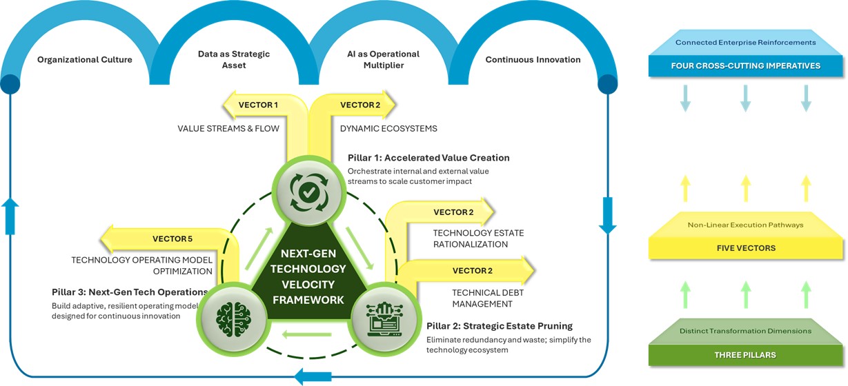 The Next-Gen Technology Velocity Framework is our field-tested methodology for bridging the gap between business strategy and technical execution. It has been developed and refined through implementations across enterprises in multiple industries and geographies.